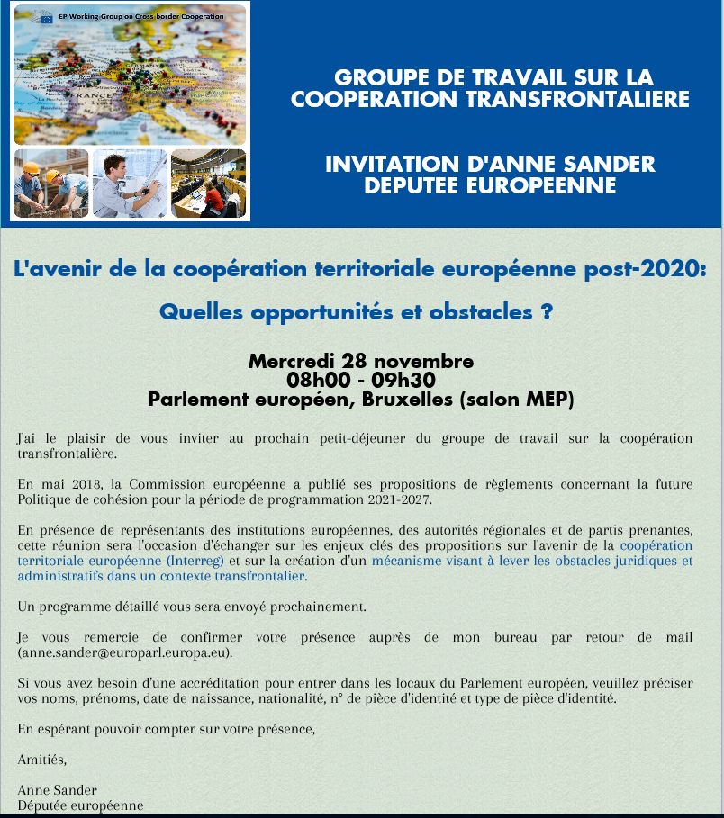 28 novembre 2018 à Bruxelles (réunion du groupe du PE)Réunion du groupe de travail sur la coopération transfrontalière, du Parlement européen, présidé par Anne Sander, Député européen et Vice-Présidente de la MOT.