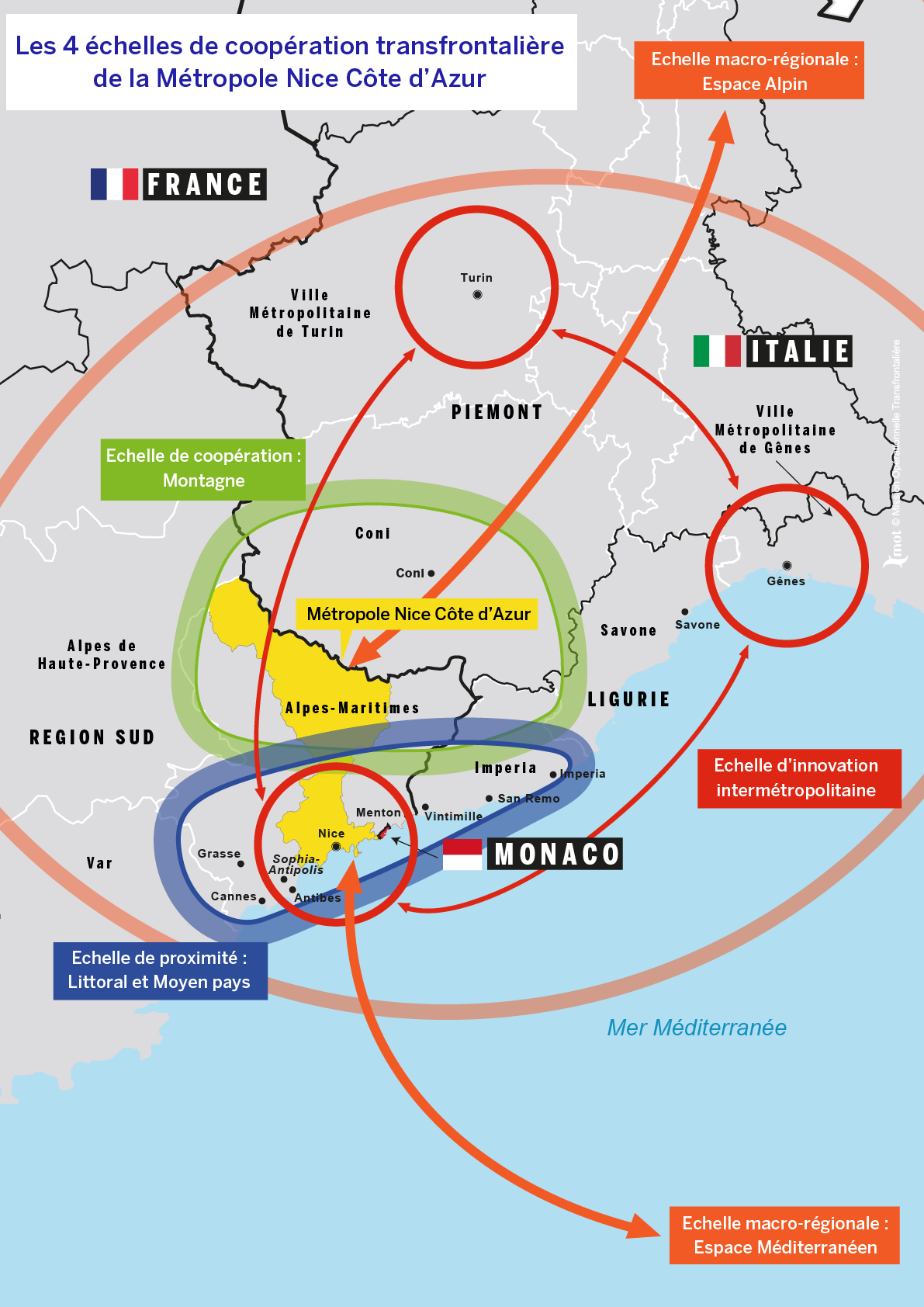 - 3. L’échelle inter métropolitaine, dont les métropoles de Gênes et Turin sont les acteurs principaux, en associant la Principauté de Monaco pour développer l’innovation transfrontalière, en particulier pour construire un espace transfrontalier de recherche et d’innovation ;